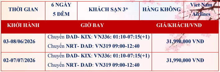 Lịch trình: ĐÀ NẴNG – OSAKA – KYOTO – NAGATO – NÚI PHÚ SĨ – TOKYO